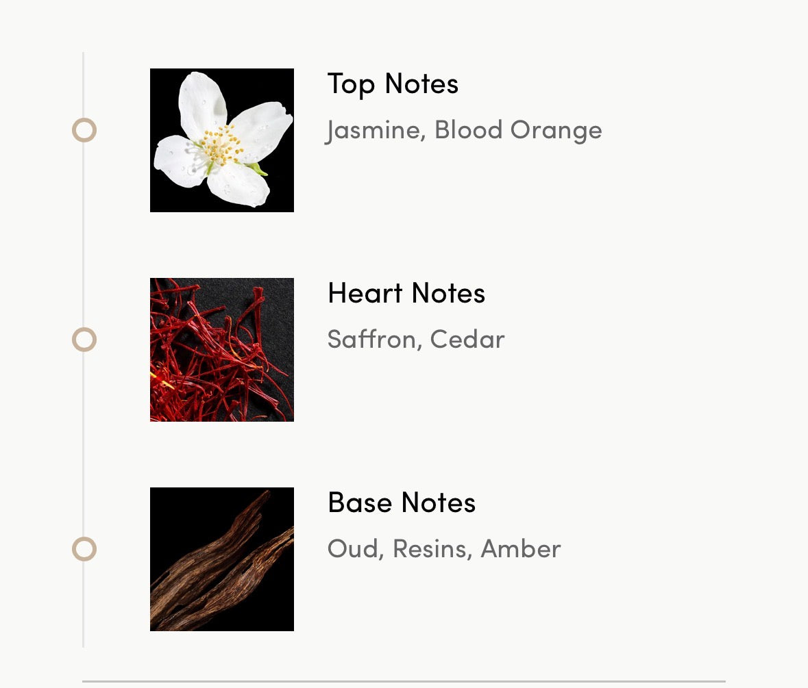 It begins with luminous jasmine paired with the zesty freshness of blood orange. The heart unfolds into the warmth of saffron and cedar, lending spice and woody elegance. Finally, the base reveals a majestic fusion of oud, resins, and amber—an enduring, sensual trail that lingers with refinement and power.
